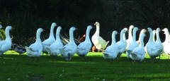 Die Bio-Eier kommen vom Geflügelhof Alpermühle, wo viele tausend Hühner sich redlich Mühe geben, uns zufrieden zu stellen. Unsere Gänse vernichten unter lautem Gegacker beim Trimborn eine Wiese im Vorbergischen, über die sie von morgens bis abends hin- und herlaufen. Damit können wir leben.